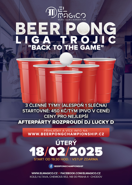Po zimní přestávce nám startuje série úterních turnajů Ligy trojic v Beer Pongu. A jako tradičně po turnaji rozjedeme nášláplou afterparty.