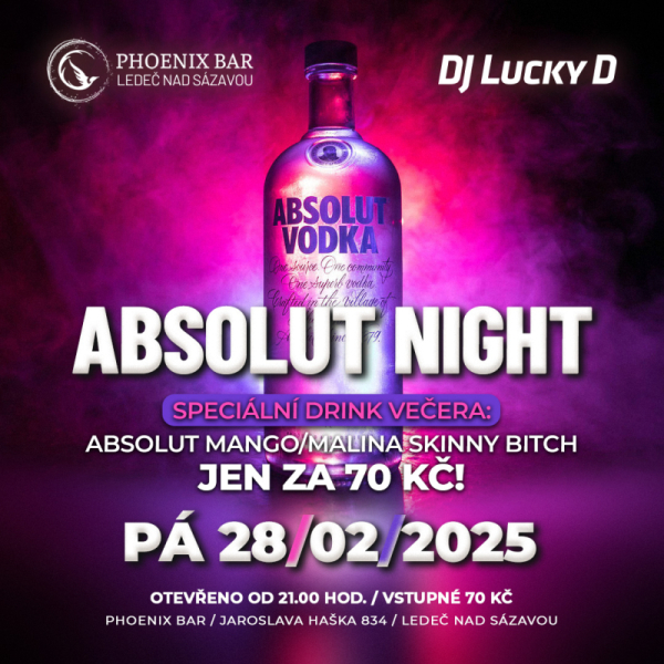 Temnto pátek se těším na Absolut Night do Phoenixu v Ledči nad Sázavou. Těším se na skvělou party, kde potečou proudem Absolut drinky za pár kaček :)