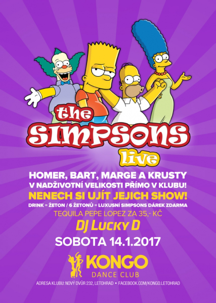 Nová akce z naší nabídky The Simpsons Live poprvé v Letohradě a klubu KONGO. Oblíbení hrdninové živě v klubu! Tady nesmíš chybět!